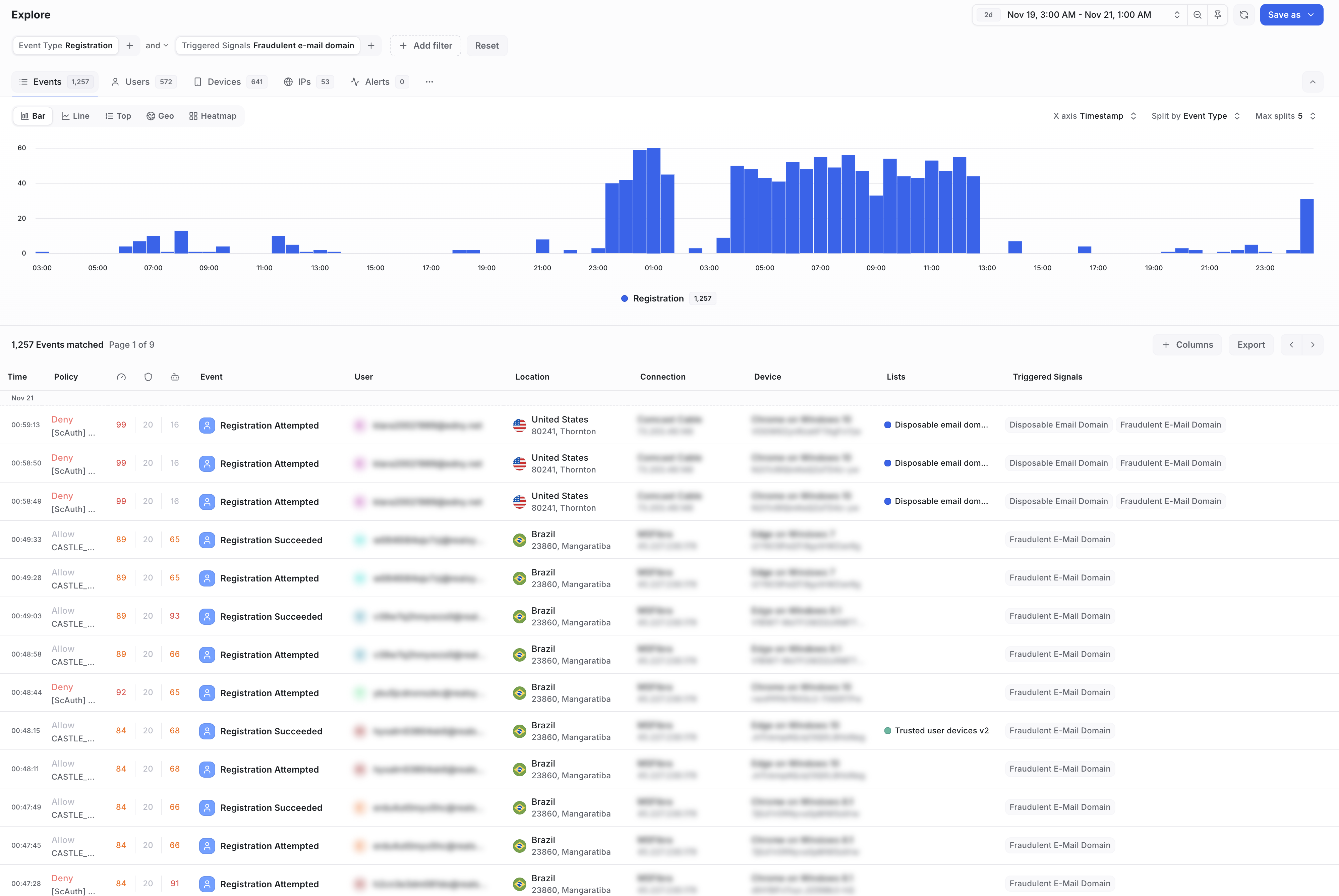 Filter by Fraudulent email domain in Explore to quickly identify and analyze coordinated fraud campaigns