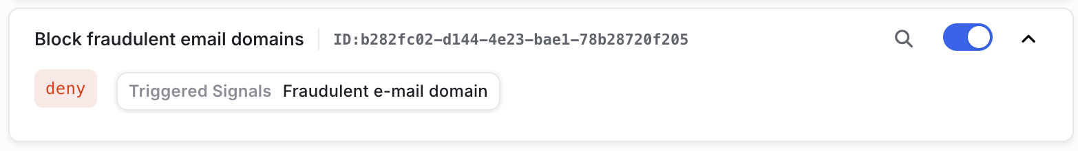 Use Fraudulent email domain in your Policies to confidently block confirmed fraud domains without false positives.